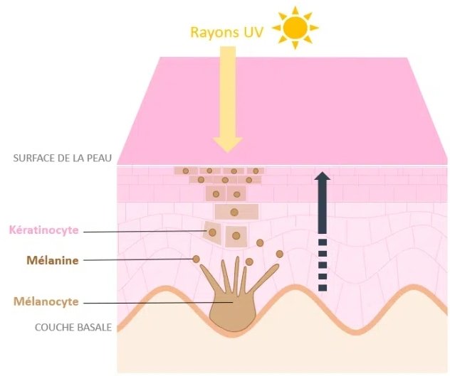 Or quand on s'expose au soleil les rayons UV font remonter la mélanine en surface pour former un bouclier pour protéger la peau, ce qui explique le changement de couleur après une séance de bronzage.