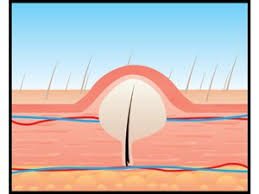 le furoncle qui est une infection plus profonde au niveau de la zone où le le poil prend racine dans la peau. Cliniquement, il apparait d'abord, un bouton rouge, douloureux au niveau d’un poil. Il augmente de volume et évolue ensuite en pustule c’est-à-dire un bouton rouge à tête blanche, contenant du pus. Le furoncle finit par se percer, il s’écoule du pu et le bourbillon (le follicule pileux détruit) qui est ainsi éliminé. Ceci laisse place à un cratère rouge puis une cicatrice définitive.