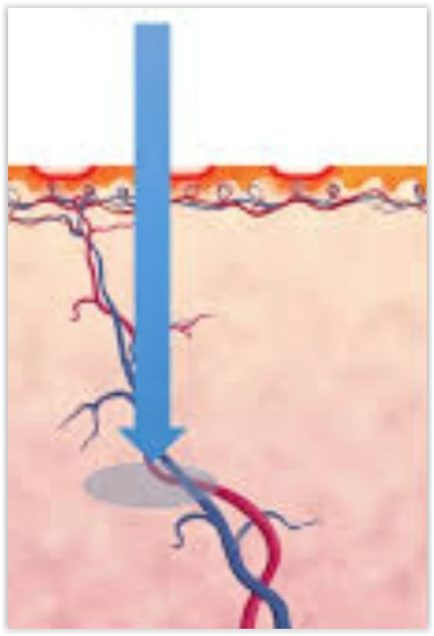 Ce laser va cibler l’hémoglobine, qui est le pigment rouge des hématies contenu dans les vaisseaux. L’onde lumineuse va créer une surchauffe au niveau du vaisseau. Cela va provoquer le phénomène de coagulation qui va fermer le vaisseau et le détruire.